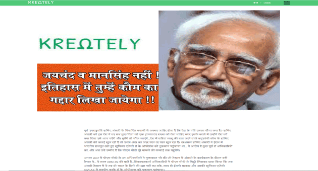 kreatelyवेबसाइट ने किया खुलासा, उपराष्ट्रपति रहे हामिद अंसारी ने देश को किस प्रकार कलंकित किया