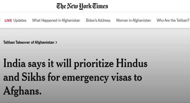 #Gravitas | The New York Times has published a fake news report claiming India is prioritising Afghan Hindus & Sikhs for visas. But India's emergency visa portal is open to all persecuted Afghans, irrespective of religion. @palkisu busts NYT's misleading report#SaveAfghanWomen pic.twitter.com/w9FDKu56tI