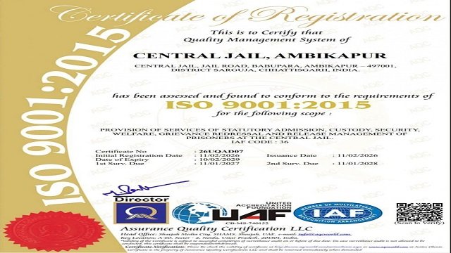 छत्तीसगढ़ की 4 सेंट्रल जेलों को मिला आईएसओ गुणवत्ता प्रमाणन